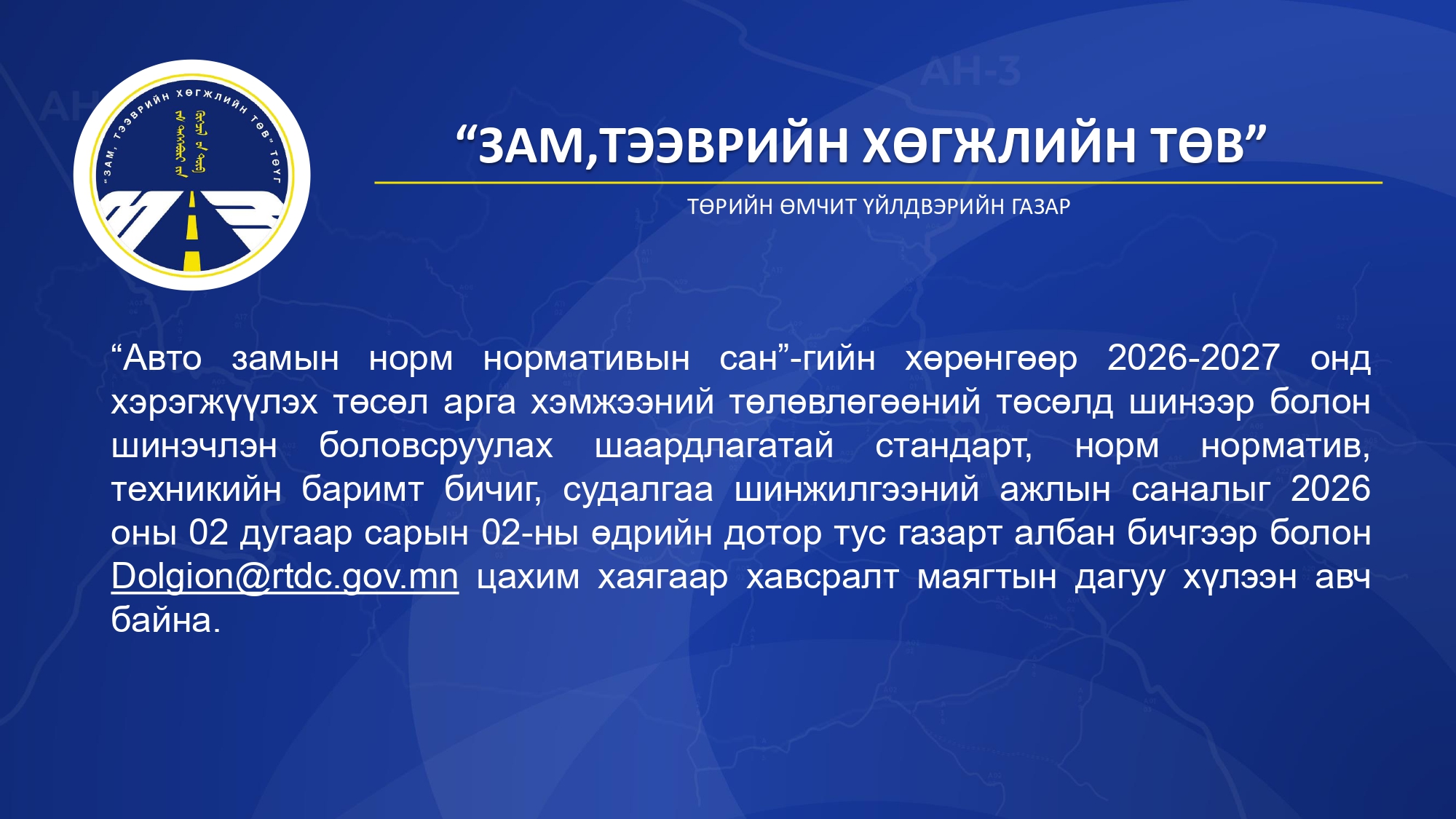 | 2 | АВТО ЗАМ, ЗАМЫН БАЙГУУЛАМЖИЙН ЗУРАГ ТӨСӨЛД МАГАДЛАЛ ХИЙЖ, ДҮГНЭЛТ ГАРГАХ ЖУРАМ | 2018.08.08 | Үзэх |