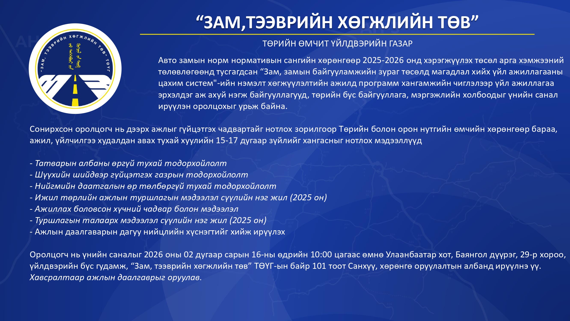 | 2 | ОЛОН УЛСЫН БОЛОН УЛСЫН ЧАНАРТАЙ ЗАМ, ЗАМЫН БАЙГУУЛАМЖААР ЗОРЧИЖ БАЙГАА ТЭЭВРИЙН ХЭРЭГСЛЭЭС АВАХ ТӨЛБӨРИЙН ХЭМЖЭЭ | 2016.02.15 | Үзэх |
