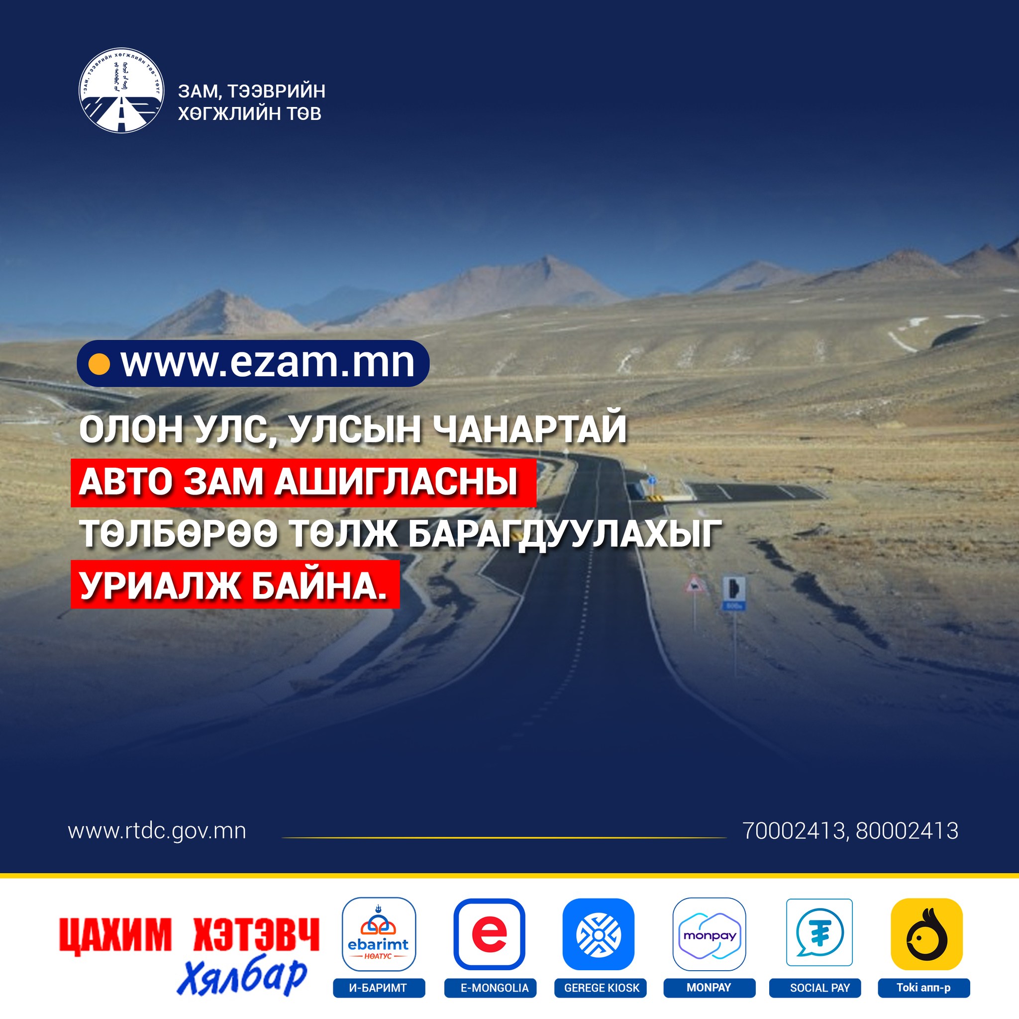 ОЛОН УЛС, УЛСЫН ЧАНАРТАЙ АВТО ЗАМ АШИГЛАСНЫ ТӨЛБӨРӨӨ ТӨЛЖ БАРАГДУУЛАХЫГ УРИАЛЖ БАЙНА.